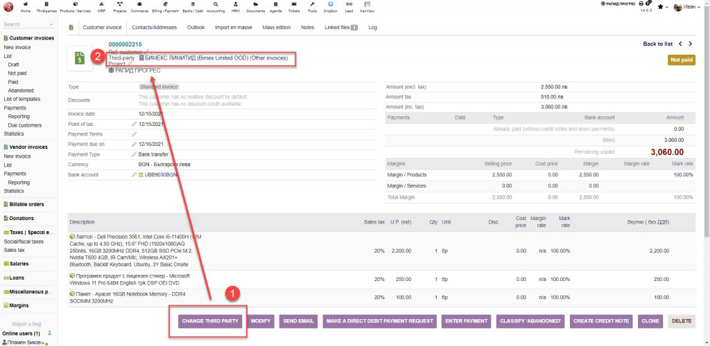 Change Thirdparty Plugin adds a button and gives the possibility to change the owner, thirdparty, without changing the ref number of the document for: - Commercial proposals - Customer Orders - Vendor proposals - Purchase orders - Contracts/Subscriptions - Customer invoices - Vendor invoices